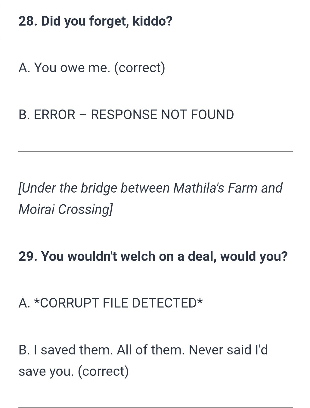 Соня Соня 13 270 9 часов назад (изменено) 7 минут назад, Ligeia сказал: Нашла этот текст про «я сказал, что спасу их всех, но не обещал спасти тебя». Типичная такая сделка с любителем кинуть под соусом «нужно четче формулировать свои желания». Но на мой взгляд, не стоит такую инфу засовывать в левый планшет, который можно пропустить, а стоит подать столь важный момент более четко и не сбивать с толку. Да, в начале квеста гг (насколько помню) жмет руку Человеку в стене, но тот выглядел как оператор, и оттого однозначной ясности для игорька, кто что и кому жал, там нет. Я еще меньше понимаю зачем Валли было кидать Дрифтера. Разве что эта реальность стала возможна ровно в тот момент, когда нужно было спасать Оператора. Изменено 9 часов назад пользователем Соня Соня Цитата Поделиться сообщением Ссылка на сообщение Поделиться на другие сайты