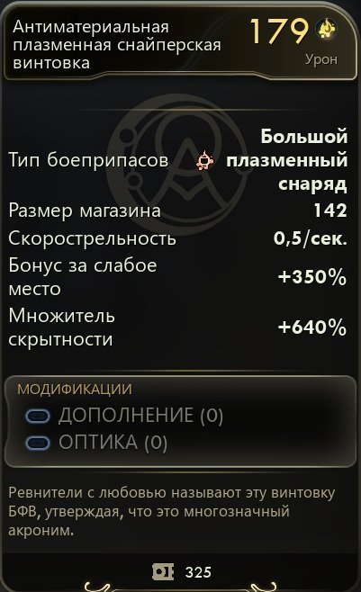 Мейс 204 7 часов назад 29 минут назад, p1cador сказал: Добыл местную БФГу Показать контент Hide Забавно, что в лоре уже есть БФГ, вернее, БФВ, которая крупнокалиберная снайперка ордена - согласно описанию её так обозвали использующие её солдаты. Показать контент Hide И да, ещё забавнее, что слово anti-materiel спустя 15 лет после Нью Вегаса всё ещё ставит в тупик переводчиков. Тогда, в Вегасе, перевод вроде с одним из патчей поправили, или с каким-то из дополнений. Как будет тут - посмотрим. Прошел её квест, и, как я понял, отговорить её от убийства нельзя вообще. Но вроде бы можно уговорить бросить орден - по крайней мере в тех ветках разговора всплывали заблокированные у меня строки с требованием прокаченной Речи. Да я уже понял у самого столько нет вон интересно что с ней тогда будет ну камон 17 очков прокачки убеждения слишком много и ни у кого другого из спутников не трубет столько. Цитата Поделиться сообщением Ссылка на сообщение Поделиться на другие сайты