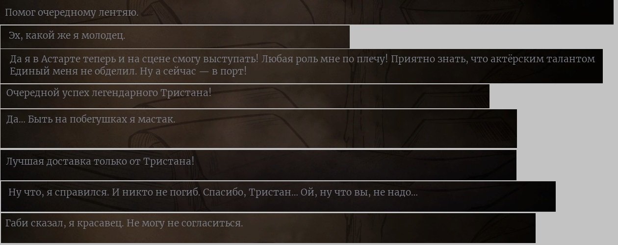 Valend 672 15 минут назад Иногда стоит перечитывать журнал заданий после выполнения квеста, чтобы посмотреть что там напишет Тристан, которому явно не грозит смерть от переизбытка скромности: Цитата Поделиться сообщением Ссылка на сообщение Поделиться на другие сайты